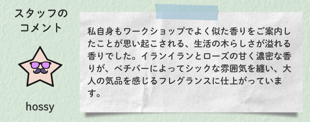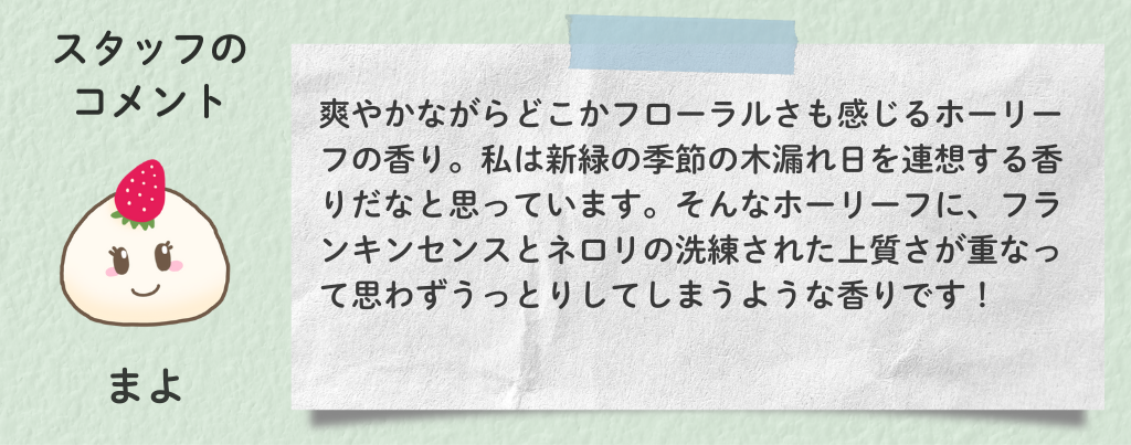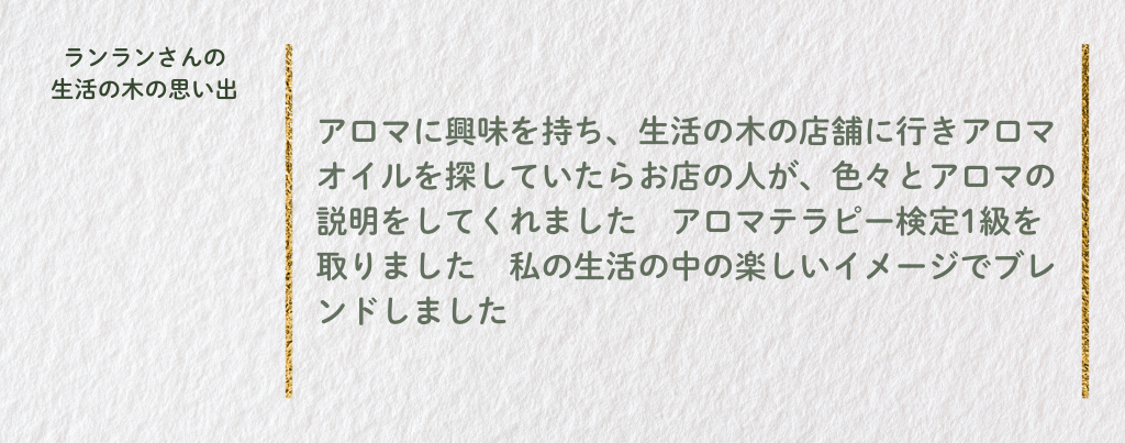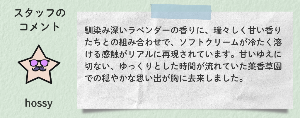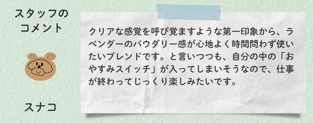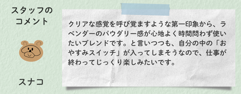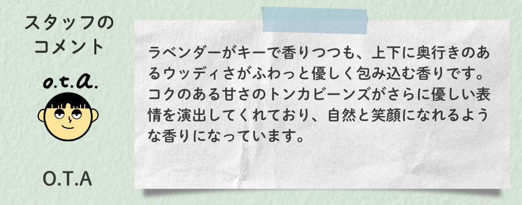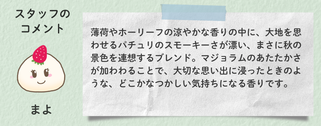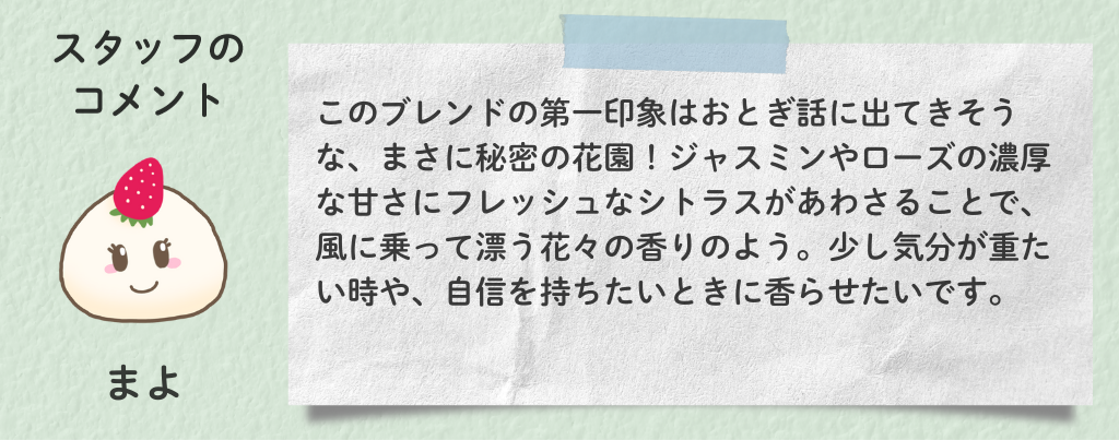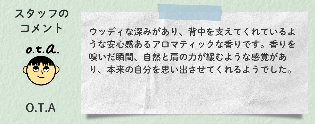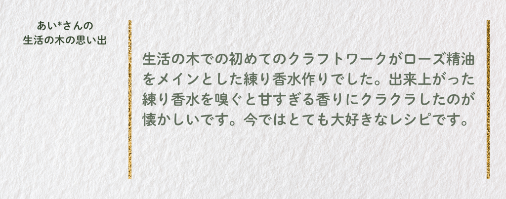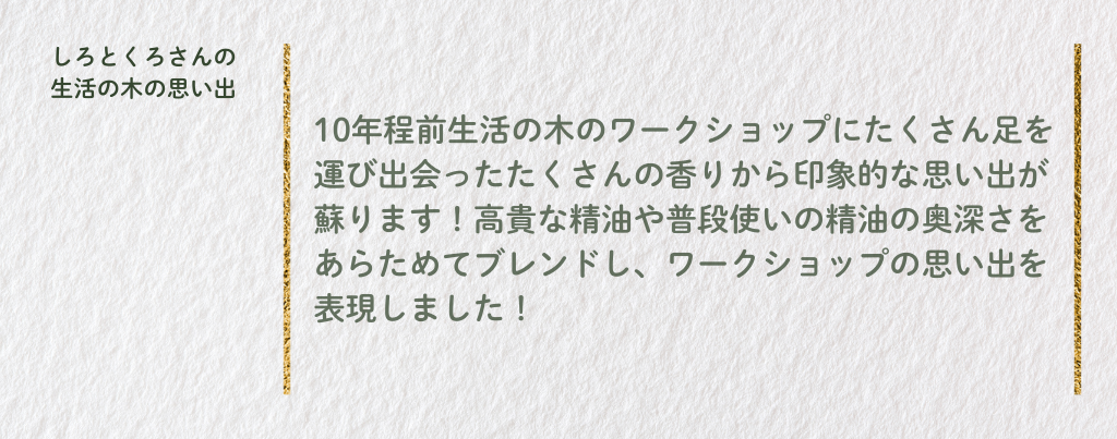 アロマ部担当スタッフ皆で香りに癒されることは毎度のことながら、添えられた文章や想いを拝見し、年月を重ねた、また、強く印象に残っている思い出を共有いただいたこと深く感謝申し上げます。