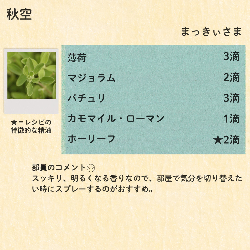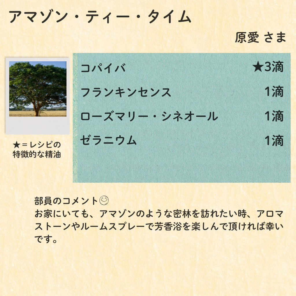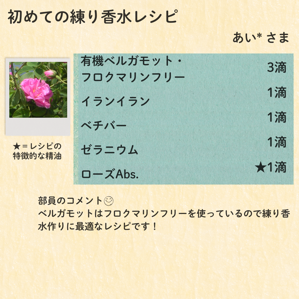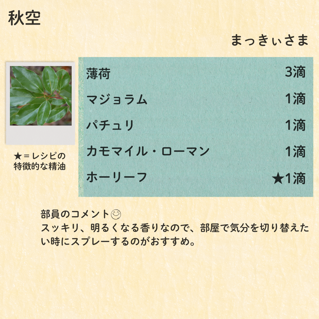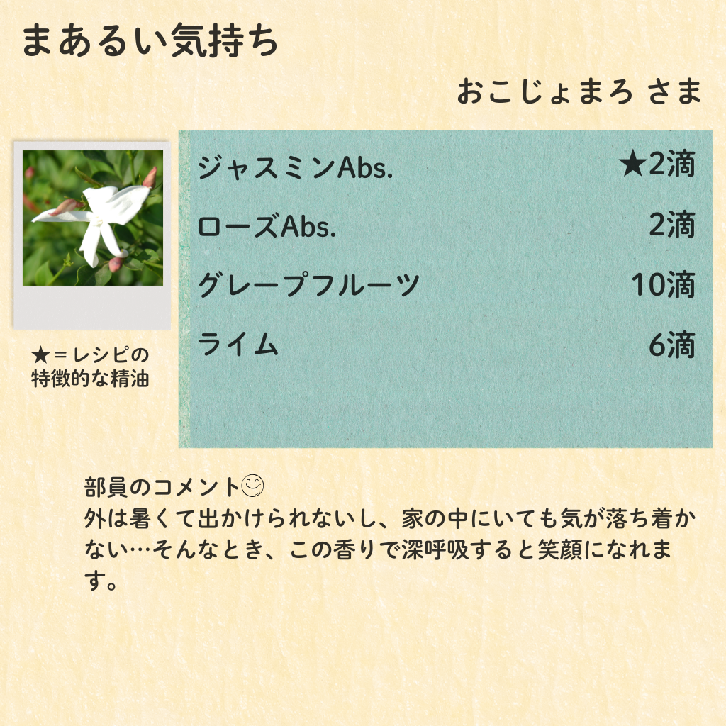 それでは、記念すべき「アロマ部 文化祭」入選アロマブレンドレシピの数々をお楽しみください。