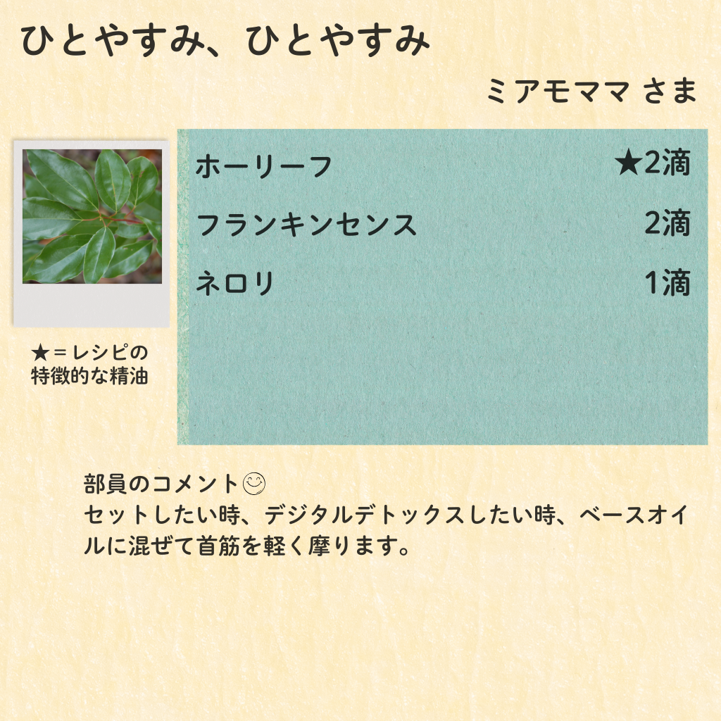 掲載されたレシピは、すべて生活の木公式アプリ「みる・よむ」>「マイアロマ」>「アロマ部 ブレンドレシピ集」から、チェックできますので、併せてご活用ください。スタッフ投稿のレシピと合わせて、現在260個のレシピを掲載中です。