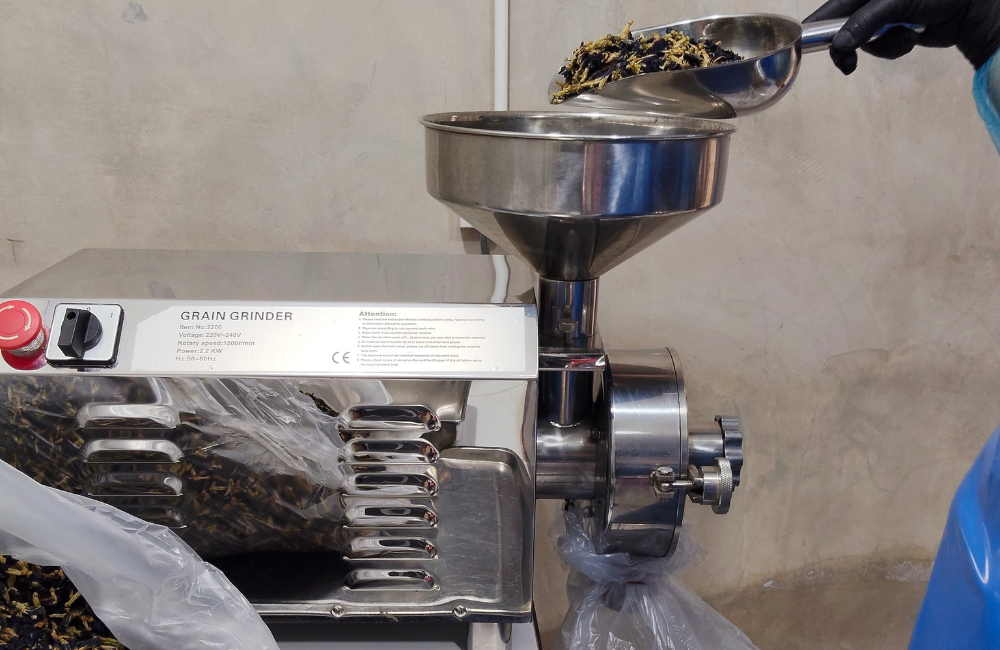 収穫したバタフライピーは昔ながらの方法で天日干しに。摘んだその日のうちに新鮮なまま乾燥させることで、高品質なドライハーブになります。