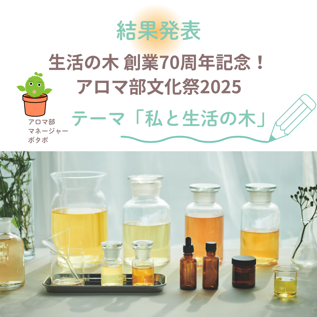 生活の木創業70周年を記念した特別イベント「アロマ部 文化祭2025」として、「私と生活の木」をテーマにしたアロマブレンドレシピを、多数ご投稿いただきました。ご参加いただいた皆様、本当にありがとうございます!